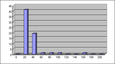 一分間に入力できる文字数(英数字)を以下に示します(設問3)。横軸は文字数、縦軸は人数です。