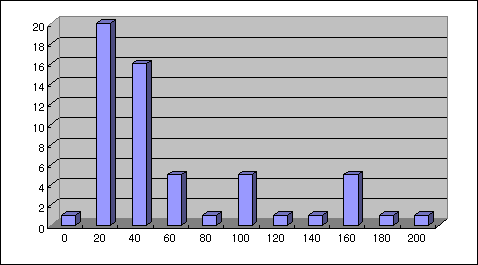 一分間に入力できる文字数(英数字)を以下に示します(設問3)。横軸は文字数、縦軸は人数です。