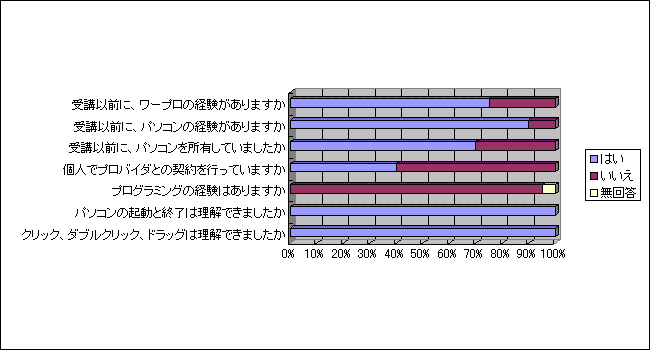 ワープロやパソコン環境、プログラミング経験についての結果(設問1〜設問3)。