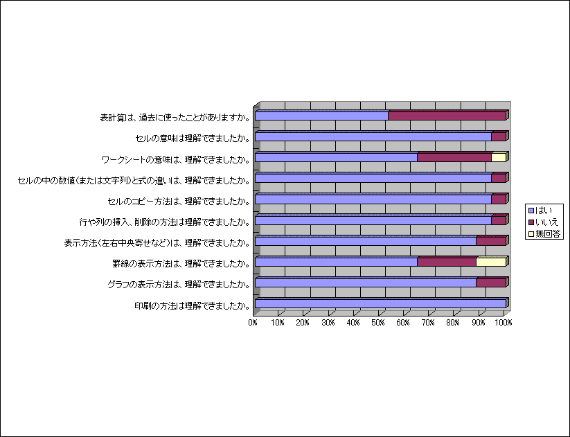 - わかり易く十分理解したつもりで授業を受けることができました。実際の場面で、どの程度活用できるか多少の不安はありますが。メール、インターネット、デジカメの活用についてもっと教えて頂きたかった。毎週水曜日が会社の休みですので、水曜日の午後。ステップアップ講座を受講したい。